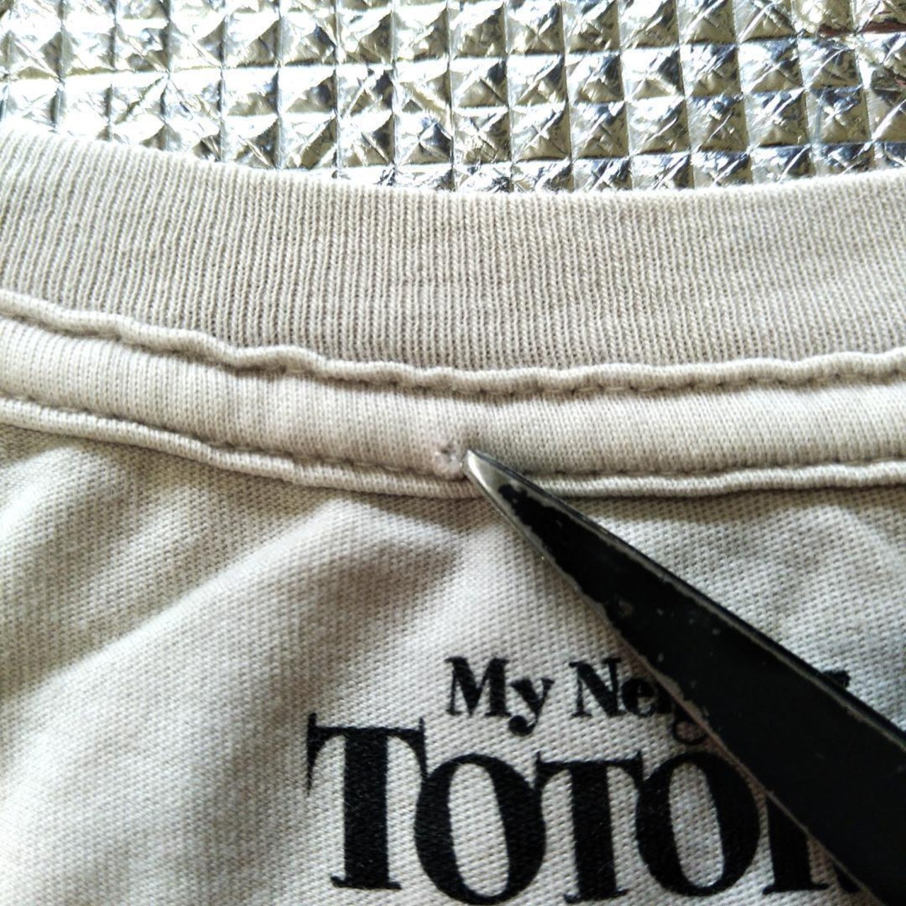未使用ですが首後ろのタグピンが刺さっていた所に穴があいています(6枚目画像)。生地が重なっており、着用時には隠れる所ですので特に問題ないかと思います。