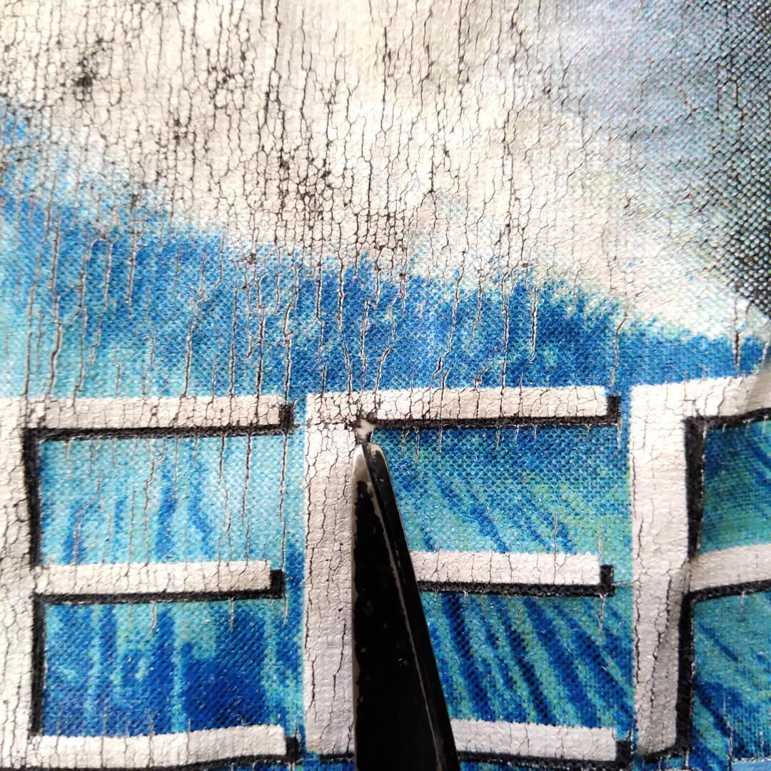おそらくドライロットだと思われますが、フロントのプリント部分の生地の編み目が粗くなっており引っ張ると破れそうな状態ですので、裏からアイロンで接着するタイプの補修布を貼ったほうがいいと思います。