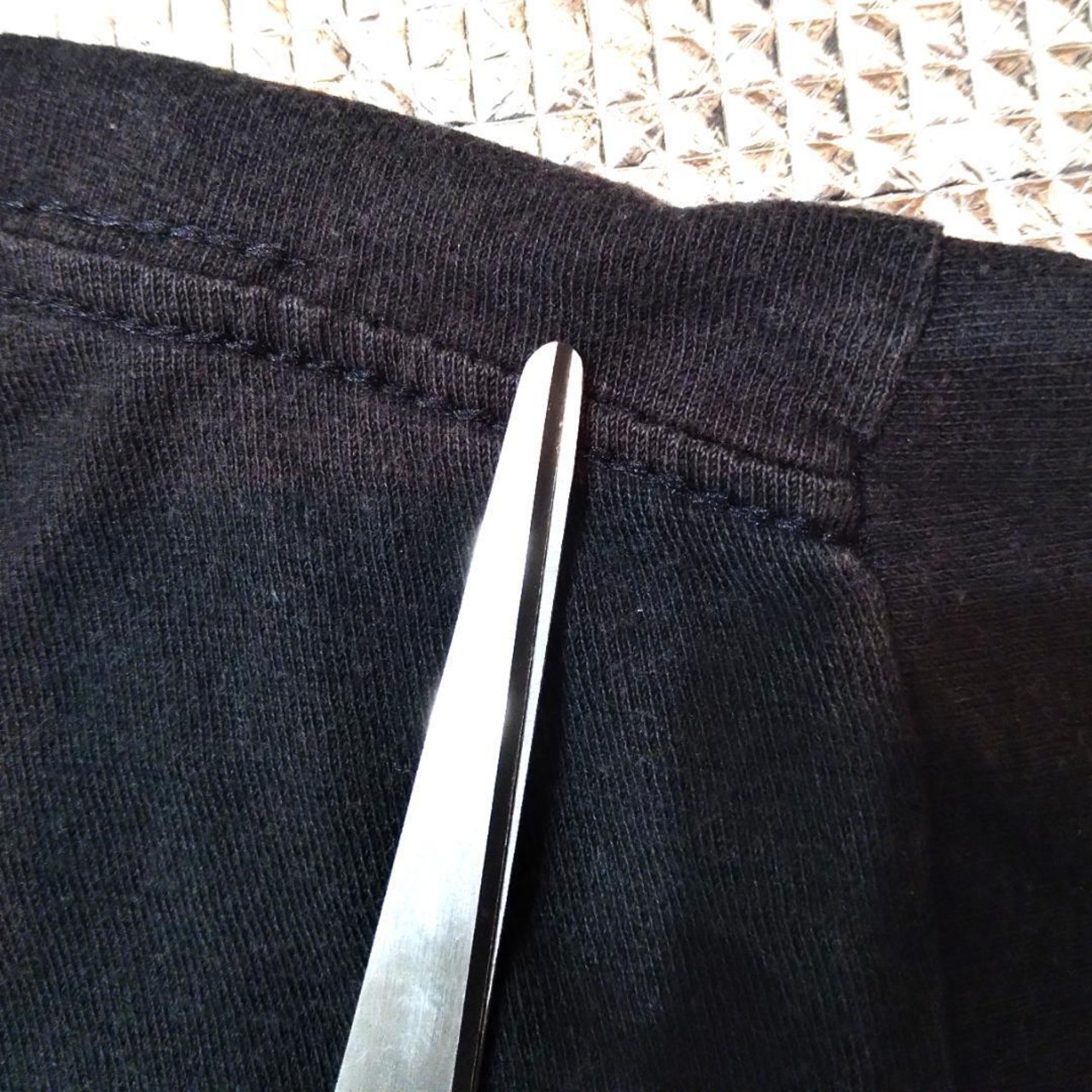 右袖のカバーステッチの片方の糸が16㎝くらいほどけています(8枚目画像)